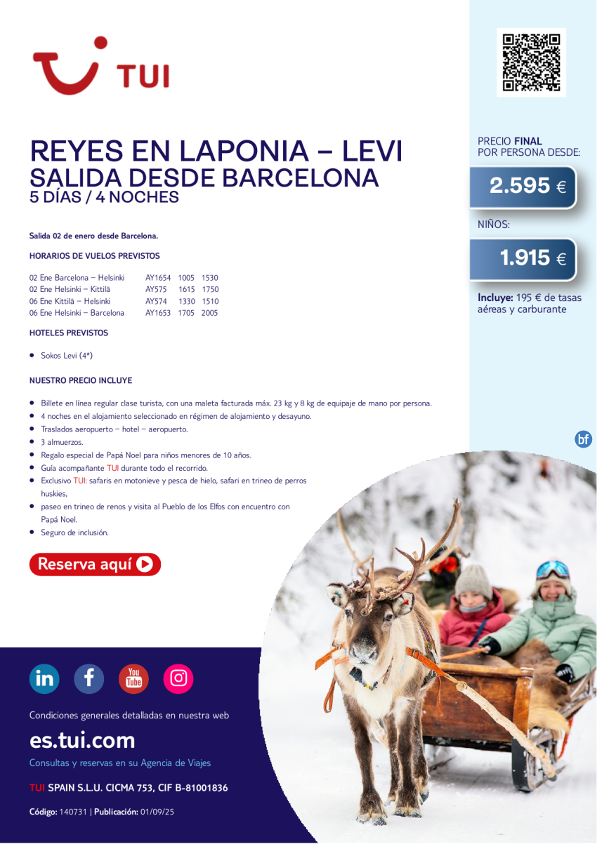 Laponia. Reyes en Levi. 5 días / 4 noches. Salida 02 ENE desde BCN desde 2.595 €