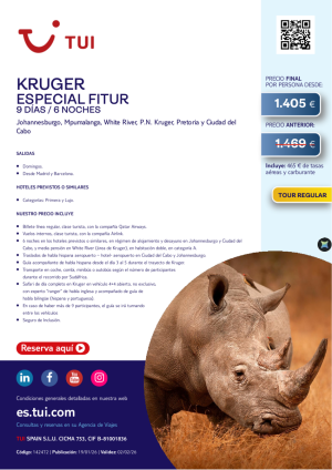 Especial Fitur. Kruger. 9 días / 6 noches. Tour Regular. Salidas domingos desde MAD y BCN desde 1.405 €
